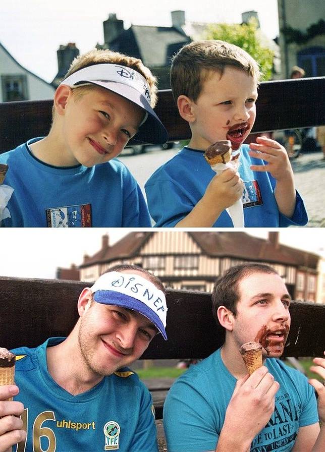 Beberapa orang di bawah ini mencoba membuat kembali foto-foto masa kecilnya dengan versi saat mereka sudah menjadi orang dewasa. Mungkin kamu juga akan terinspirasi untuk membuatnya setelah melihat foto-fotonya di bawah ini.