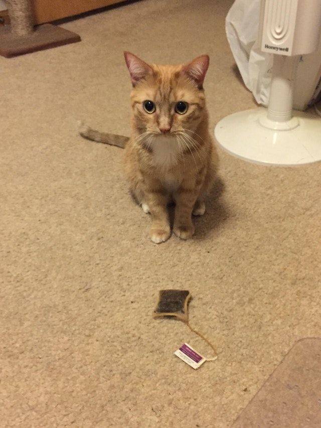 1. Kalau biasanya kucing bawa pulang tikus, yang satu ini kasih teh celup buat majikannya. Polos banget lagi ekspresinya
